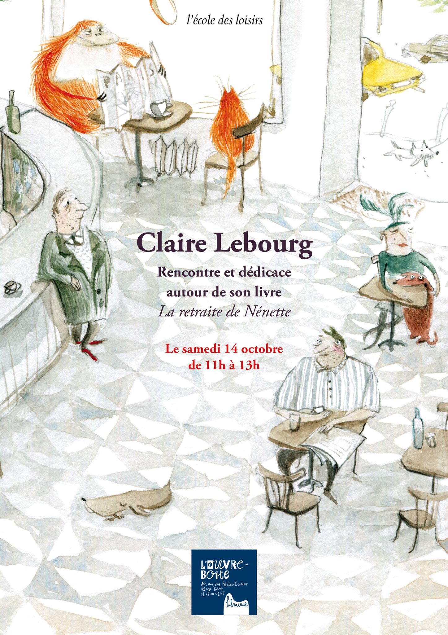 Claire Lebourg sera en dédicace à la librairie L'ouvre-Boîte de Paris 10e le samedi 14 octobre de 11h à 13h.